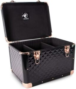 Wie die UNIQHORSE Putzbox Curve bietet sie den gleichen Stauraum für alle Putzutensilien und auch Flaschen können dort senkrecht aufbewahrt werden. Durch die herausnehmbaren und flexibel einsteckbaren Trennwände kann man sich das Innenleben der Box so gestalten, wie man möchte.