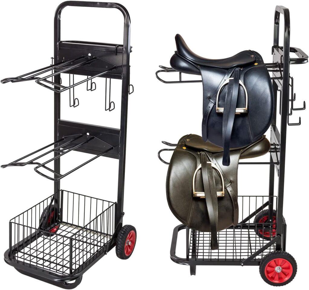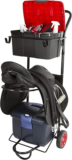 Ein Sattelwagen, Sattelkarre oder Sattelcaddy ist eine extrem praktische Erfindung. Ein solcher Wagen eignet sich für all jene, deren Sattelkammer sich weiter weg befindet oder die eine Sattekammer haben aber sich darin keine Schränke befinden. Eine solche Sattelkarre lässt sich mit allem bestücken, was man als Reiter braucht. Dort finden Sattel, Trensen, Longier- und Bodenarbeitsleinen, Halfter und Putzkästen ihren Platz.