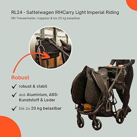Der IRHCarry Light von Imperial Riding ist ein klappbarer Sattelwagen in Schwarz, der mit robusten Geländerädern eine einfache Mobilität auf jedem Untergrund gewährleistet. Er bietet viel Platz für Sattel, Trense und Pflegeutensilien. Der Sattelhalter und der Korb sind abnehmbar und können praktisch an der Stalltür aufgehängt werden. Mit einer Belastbarkeit von bis zu 20 kg erleichtert dieser Sattelcaddy den Stallalltag und ist zudem platzsparend zu verstauen.