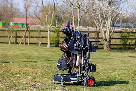 Der Nedlandic Sattelwagen für Westernsättel ist extrem robust und kippsicher. Mit einer Höhe von 114 cm, Breite 72 cm und Länge 92 cm bietet er sicheren Stand. Das unzerstörbare Fahrgestell aus Strukturschaum ist flexibel und widerstandsfähig. Zwei große Luftreifen am Heck und Schwenkräder mit Bremse ermöglichen einfaches Manövrieren und sicheren Halt, auch auf unebenem Gelände oder Hang. Die stabile, abnehmbare Metall-Sattelstütze mit Nutex-Beschichtung sorgt für optimalen Sitz und Schutz des Westernsattels. Zwei herausnehmbare Ablagefächer bieten praktischen Stauraum unter dem Schiebegriff. Eine zusätzliche Sattelstütze kann hinzugefügt werden, um zwei Sättel gleichzeitig transportieren zu können.